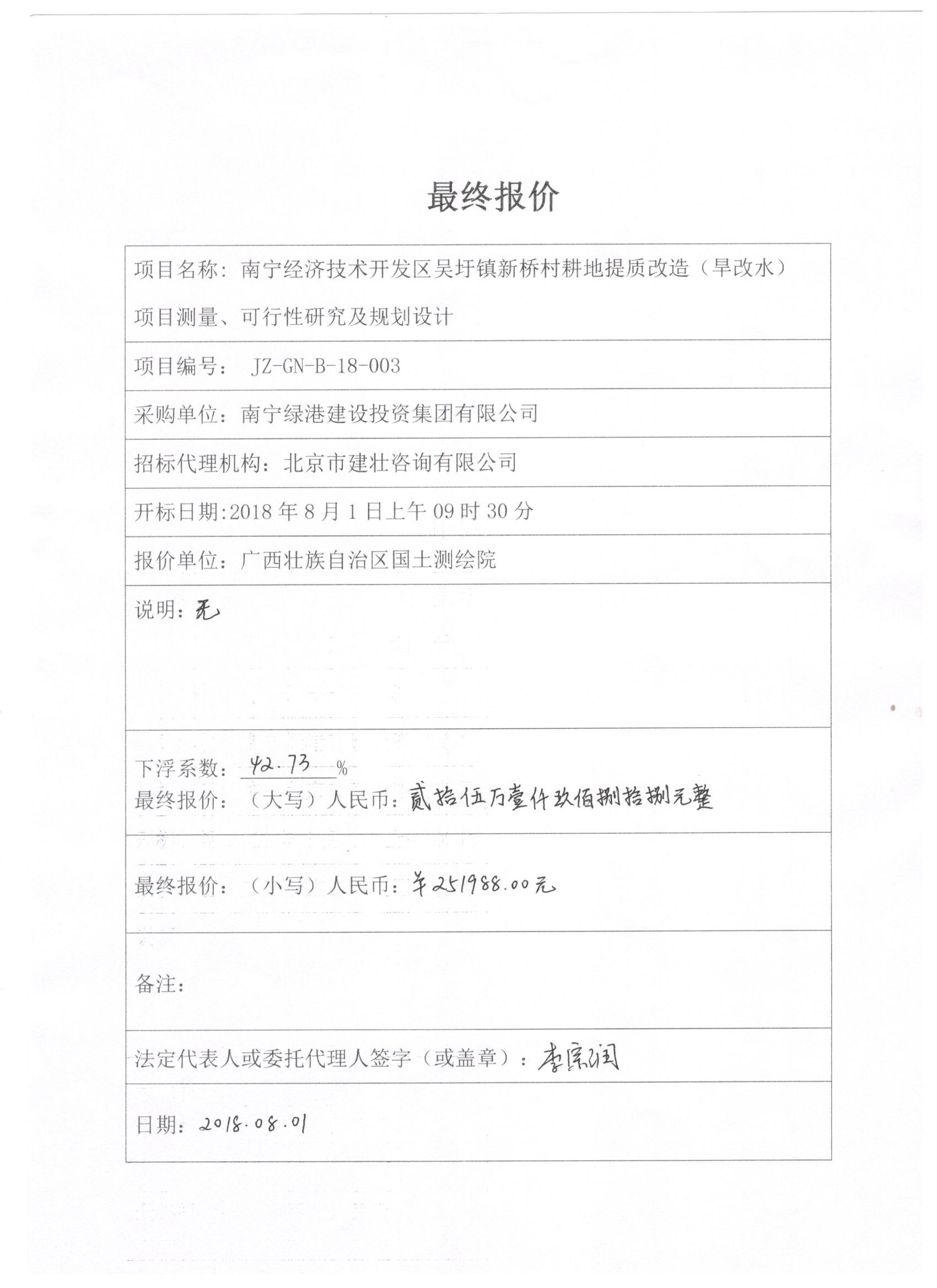 北京市建壯咨詢有限公司受南寧綠港建設投資集團有限公司委托,根據《中華人民共和國政府采購法》等有關規(guī)定,于2018年8月1日就南寧經濟技術開發(fā)區(qū)吳圩鎮(zhèn)新橋村耕地提質改造(旱改水)項目測量、可行性研究及規(guī)劃設計以競爭性磋商方式進行采購,現(xiàn)就本次采購的成交結果公告如下: