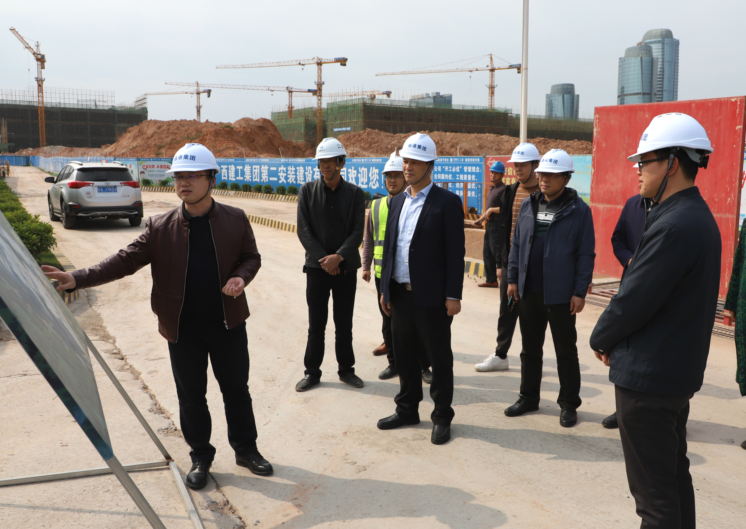 交流學(xué)習(xí)組一行首先來到綠港·金瑞產(chǎn)業(yè)城一期項目施工現(xiàn)場,參觀項目建設(shè)情況,集團(tuán)黨委書記、董事長龔國強向交流學(xué)習(xí)組介紹了綠港·金瑞產(chǎn)業(yè)城項目情況:綠港·金瑞產(chǎn)業(yè)城項目位于南寧經(jīng)開區(qū)高嶺路南側(cè)、金陽路西側(cè),占地245畝,總投資約13億元,總建筑面積約406039.74㎡。項目包括17個單體建筑,分三期建設(shè),該項目是南寧市級層面統(tǒng)籌推進(jìn)的重大項目,是為廣西千億產(chǎn)業(yè)園——瑞聲科技(南寧)產(chǎn)業(yè)園量身定制的高標(biāo)準(zhǔn)廠房。項目投產(chǎn)后,可加快推動南寧經(jīng)開區(qū)工業(yè)經(jīng)濟(jì)新舊動能加速轉(zhuǎn)換,優(yōu)化區(qū)域營商環(huán)境,助推南寧經(jīng)開區(qū)核心實體經(jīng)濟(jì)的發(fā)展。