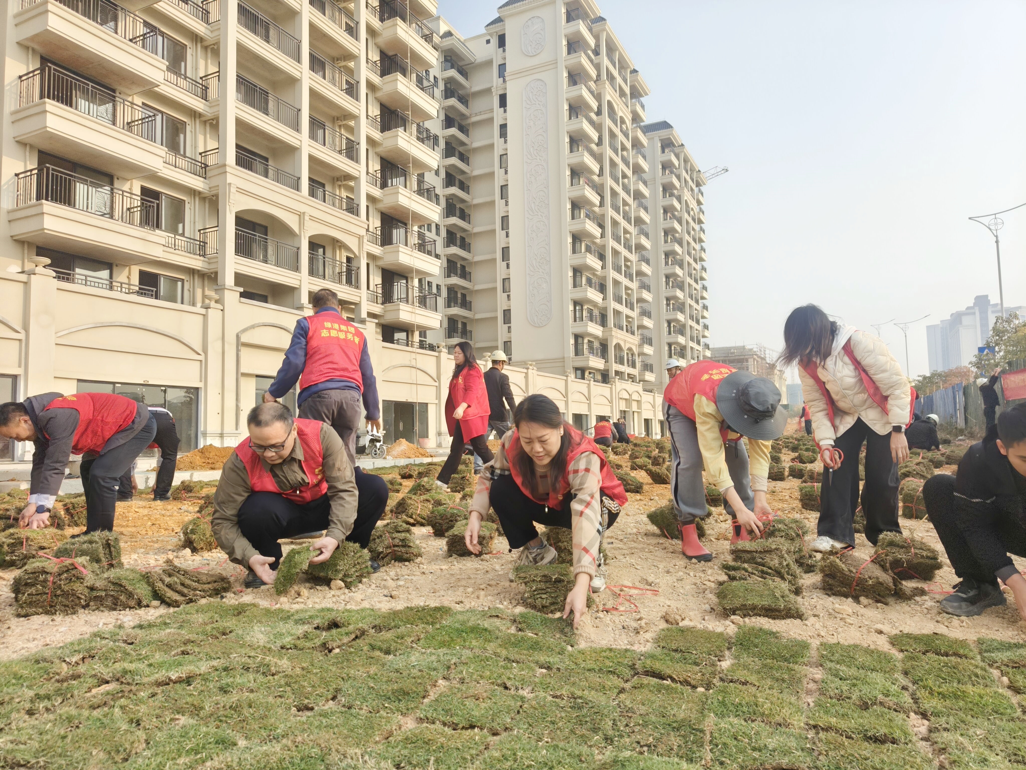 號(hào)角既已吹起,行動(dòng)便無(wú)止息?;顒?dòng)中,緊張有序的項(xiàng)目施工現(xiàn)場(chǎng),呈現(xiàn)出一派熱火朝天的景象。嘉通公司黨支部、榮鑫公司黨支部的黨員及入黨積極分子們以身作則,與施工人員并肩作戰(zhàn),身著志愿者服裝,精神抖擻地投入到草坪鋪植工作中。大家各司其職、分工明確,齊心協(xié)力,有的負(fù)責(zé)搬運(yùn)草皮,有的進(jìn)行地面平整,有的仔細(xì)鋪設(shè)草皮,有的負(fù)責(zé)澆水養(yǎng)護(hù),每一個(gè)環(huán)節(jié)都嚴(yán)謹(jǐn)認(rèn)真、有條不紊,確保施工工程質(zhì)量和效果經(jīng)得起檢驗(yàn)。經(jīng)過(guò)全員共同努力,短短3個(gè)小時(shí),共完成了鋪植草皮50000塊,草坪面積共計(jì)2000㎡,呈現(xiàn)一派生機(jī)盎然,切實(shí)以實(shí)際行動(dòng)踐行初心使命,為項(xiàng)目“保交付”的順利推進(jìn)提供了堅(jiān)實(shí)保障。